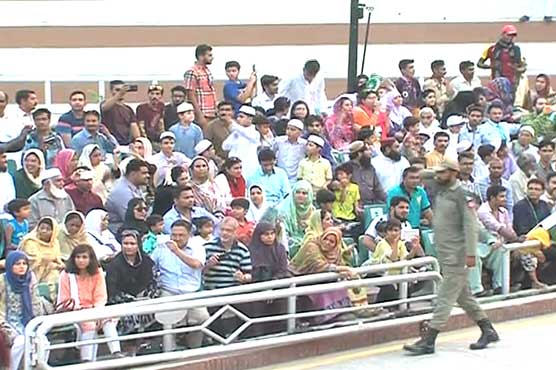 LAHORE (Dunya News) – Flag-lowering ceremony held at Wagah border, a border that Pakistan shares with India, saw Indians maintain silence while over six feet tall, black-clad Pakistani Rangers boasted Pakistan’s moral in tensed relations and their march daunted the enemy.