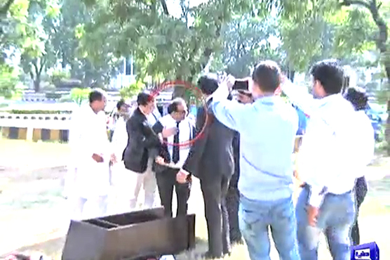 ISLAMABAD (Dunya News) – Leaders of Pakistan Muslim League-Nawaz (PML-N) addressed a press conference on Tuesday using a rostrum, exclusive to them, after a clash with members of Pakistan Tehreek-e-Insaf (PTI) yesterday who walked off with their dais leaving Daniyal Aziz high and dry.