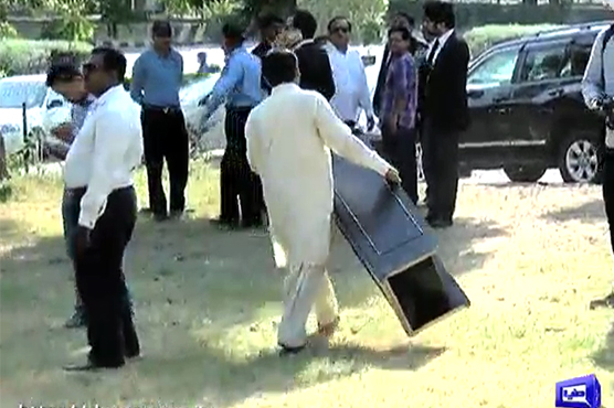 Naeemul Haq of PTI addressed the press on Monday in the federal capital and as he concluded his brief, workers of PML-N shifted the dais to backseat of his four-wheel drive. Daniyal Aziz, leader of PML-N who was to address next seemed troubled.