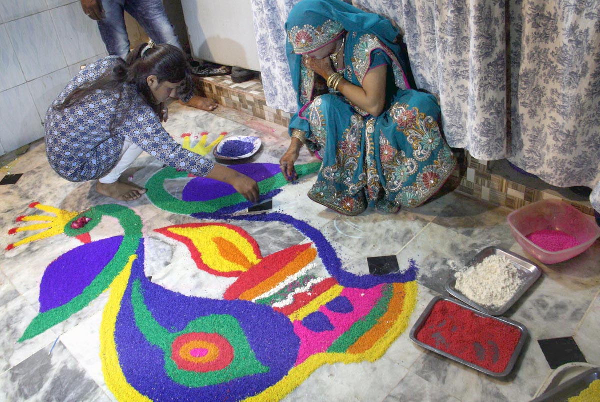 Women of Hindu community are making rangoli patterns on the floor using different colors in connection with celebrations of Diwali at Shri Swaminarayan Mandir. Photo: OINN