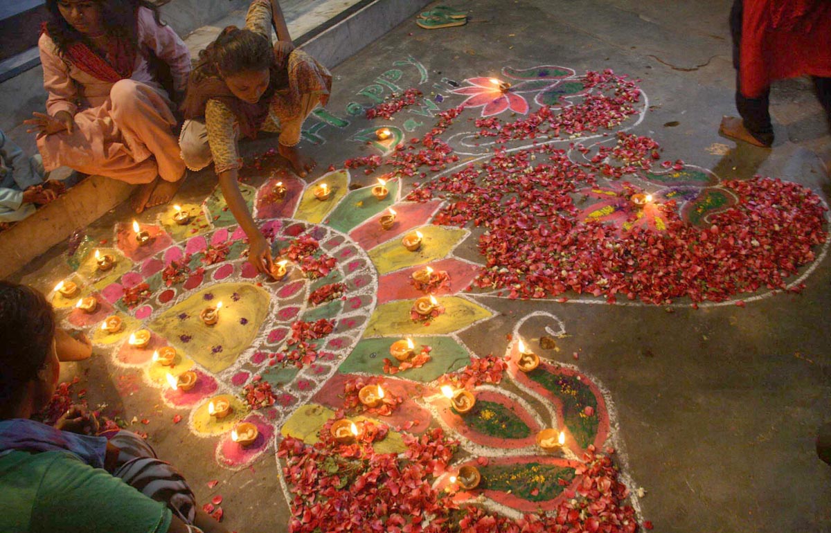 Women of Hindu community are lighting lamps on rangoli patterns. Photo: OINN
