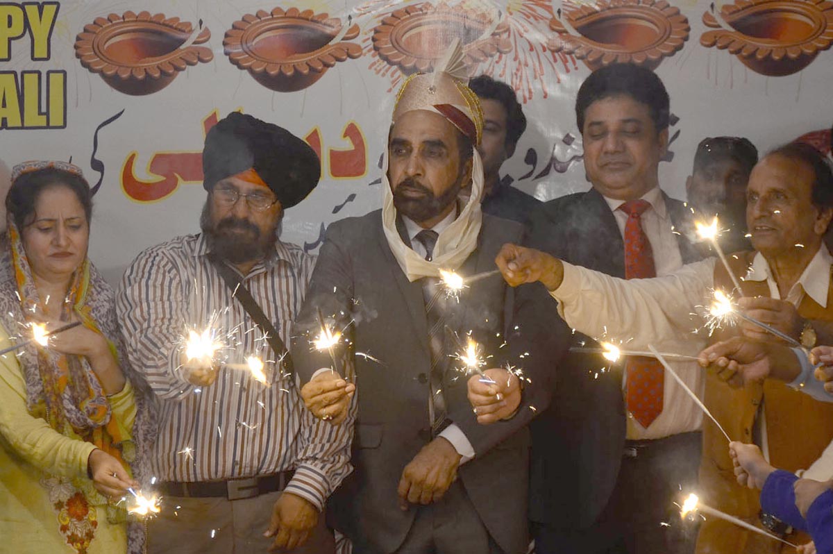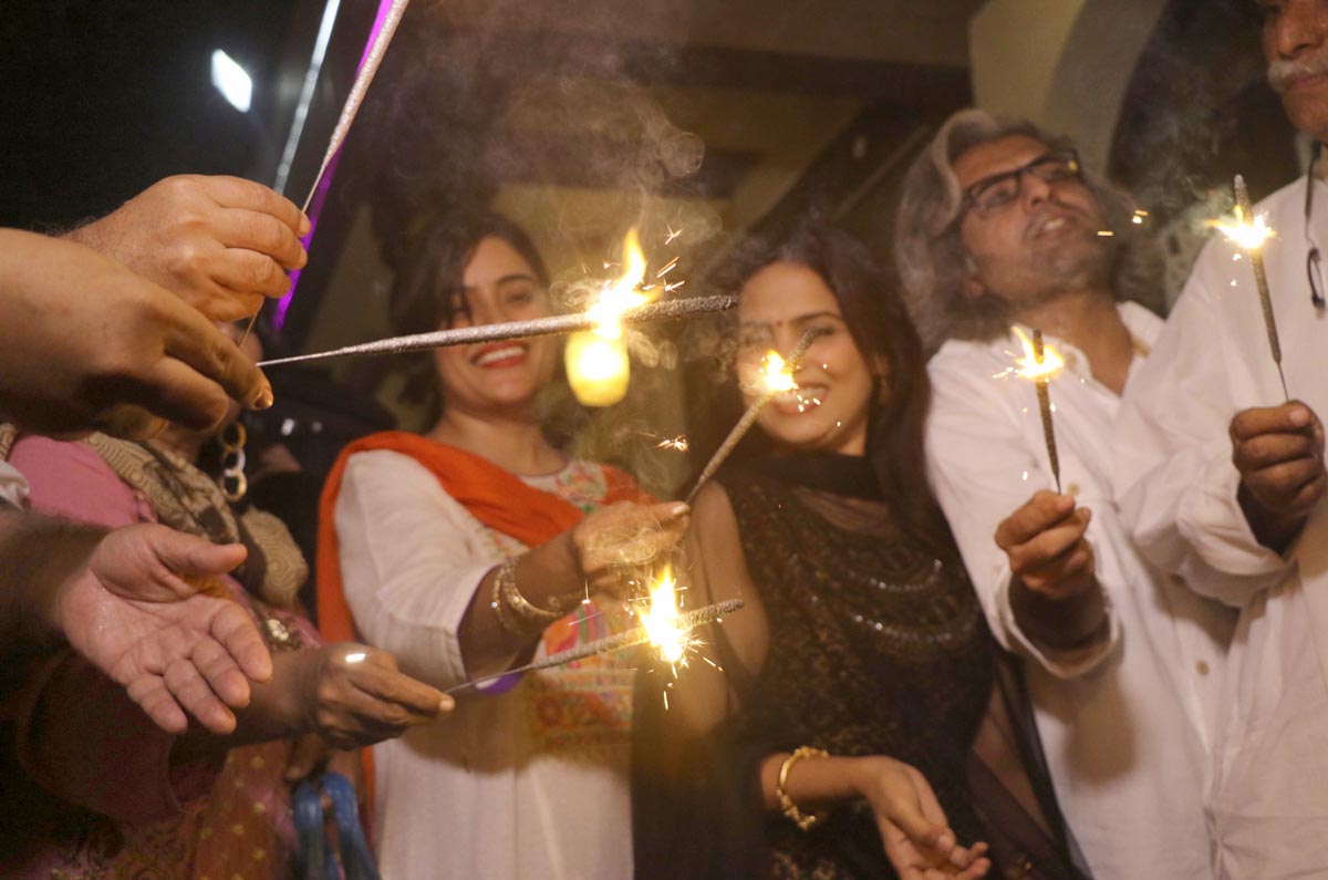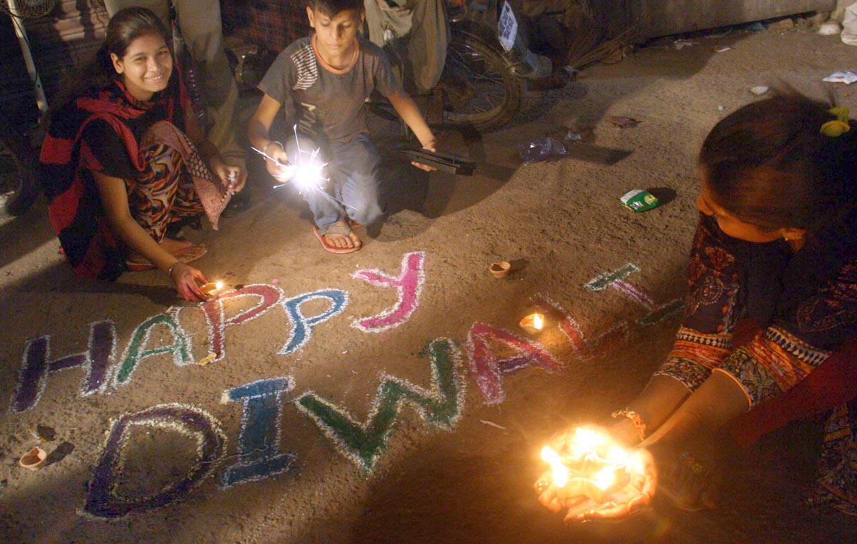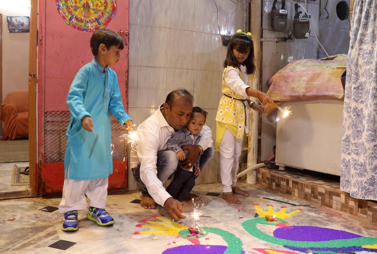 Members of Hindu community are lighting sparklers in Karachi. Photo: OINN