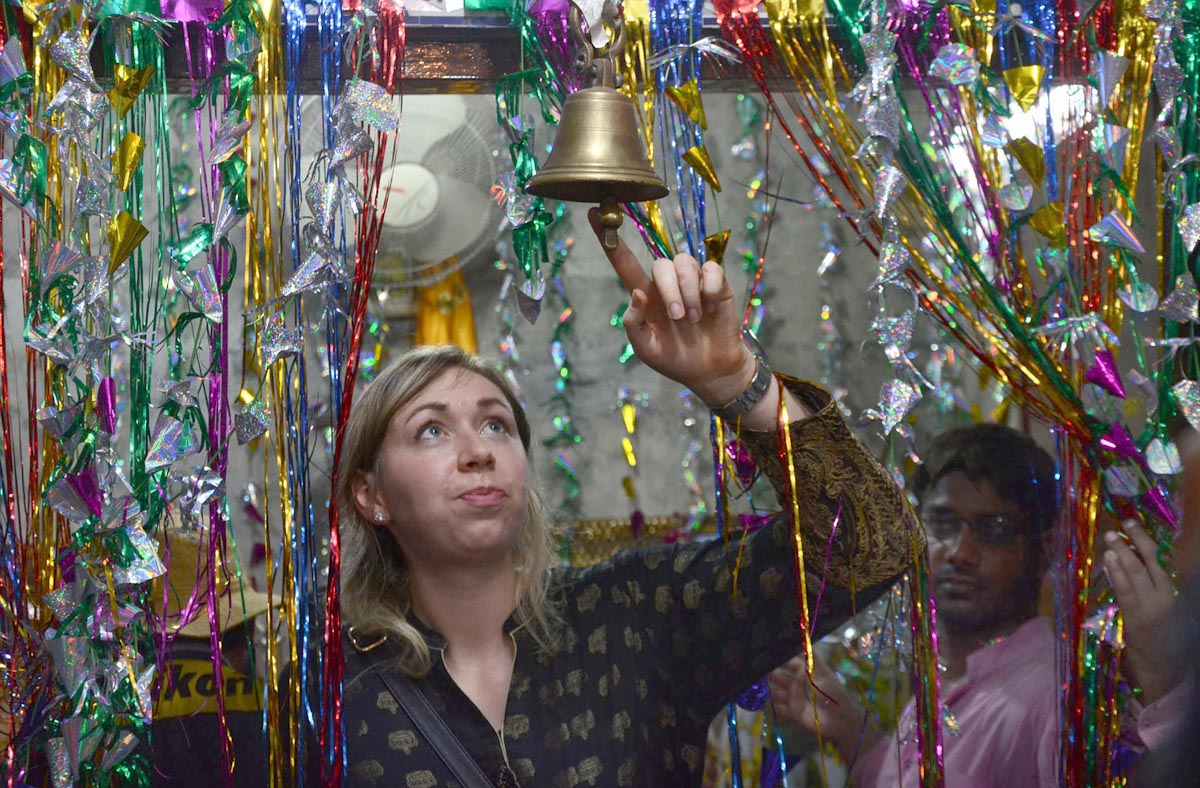 A foreigner rings the bell of a temple during celebrations of Diwali. Photo: OINN
