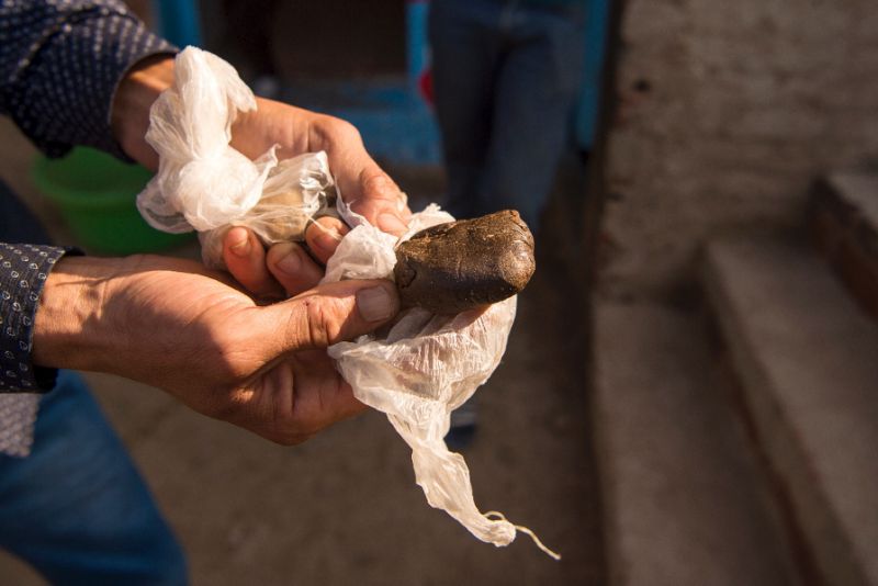 The two groups met in front of a modest building where a farmer tapped a container full of cannabis clippings, collecting the finely powdered resin in a bucket below.