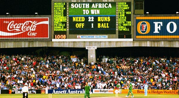 South Africa would ‘choke’ once more after reaching the semi-finals of the tournament. Herschelle Gibba dropped a crucial catch allowing Australians to score. South African chase however, was up to the mark with Klusner leading them until the last over. A mix-up by tail ender Allan Donald led to a surprising defeat. The word ‘choke’ churned out of the press at this instance for South Africa, first time in the history.