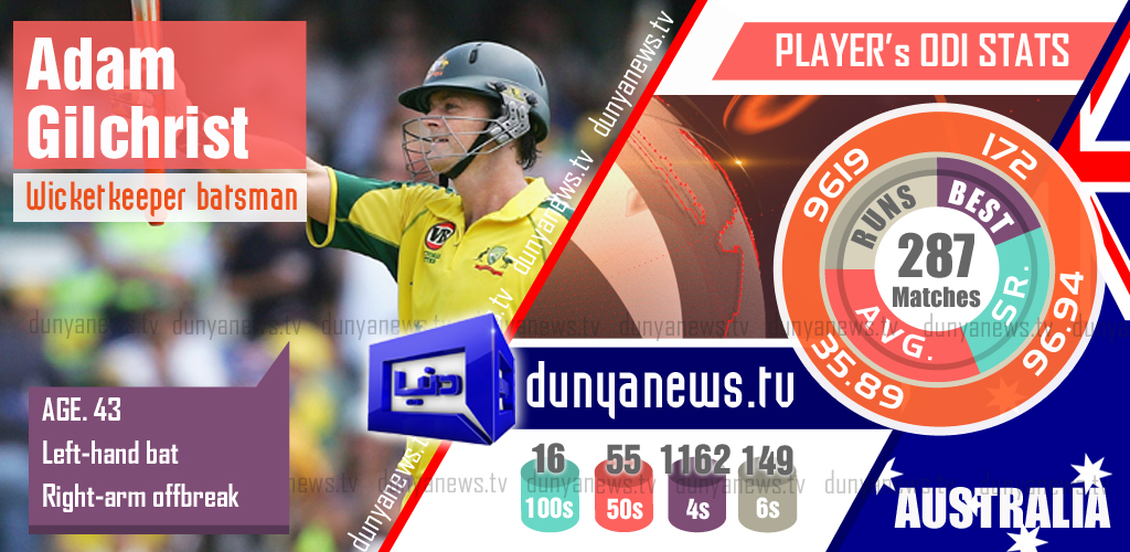Gilchrist scored 9,619 runs at an average of 35.89 and strike rate of 96.94 in the 287 matches that he played. He scored 16 centuries and 55 half-centuries and was one of the best No. 6 batsmen of his time. He was part of the world cup winning Australian squads of 1999, 2003 and 2007 and scored 1085 runs in 31 world cup matches that he played.