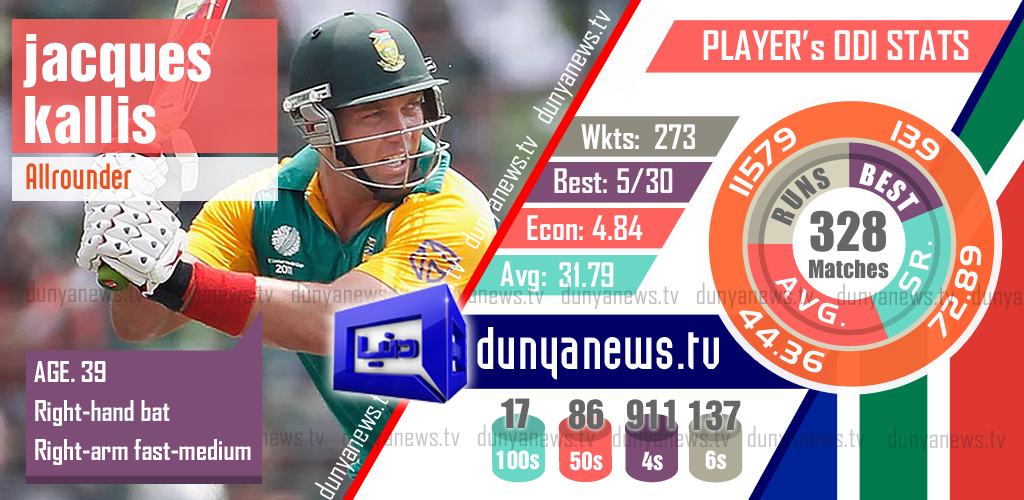 Kallis played 36 world cup matches from 1996 to 2011 and scored 1148 runs at an average of 45.92 and scored 1 century and 9 half-centuries.