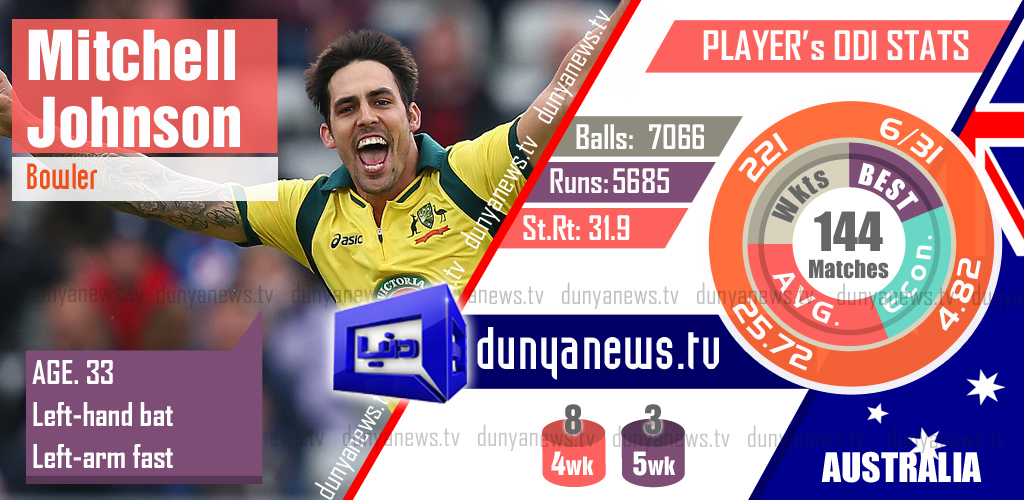 Mitchell Johnson is an express pace left arm bowler who plays for Australia. The leader of the bowling pack, in both tests and ODIs, he swings the ball both ways with the red and the white ball. His arsenal contains fiery pace, extricating bounce from pitch and late swing, all of which spell doom when he is on song. 33 years of age, Johnson has hit peak in the recent times and is virtually unplayable in his home turf when the conditions are right. His 221 wickets at the average of 25.72 in the 50 overs format are a proof of his lethality. Not a stranger to late order hitting, he can smack a few if need be. He has a test century to his name as well.