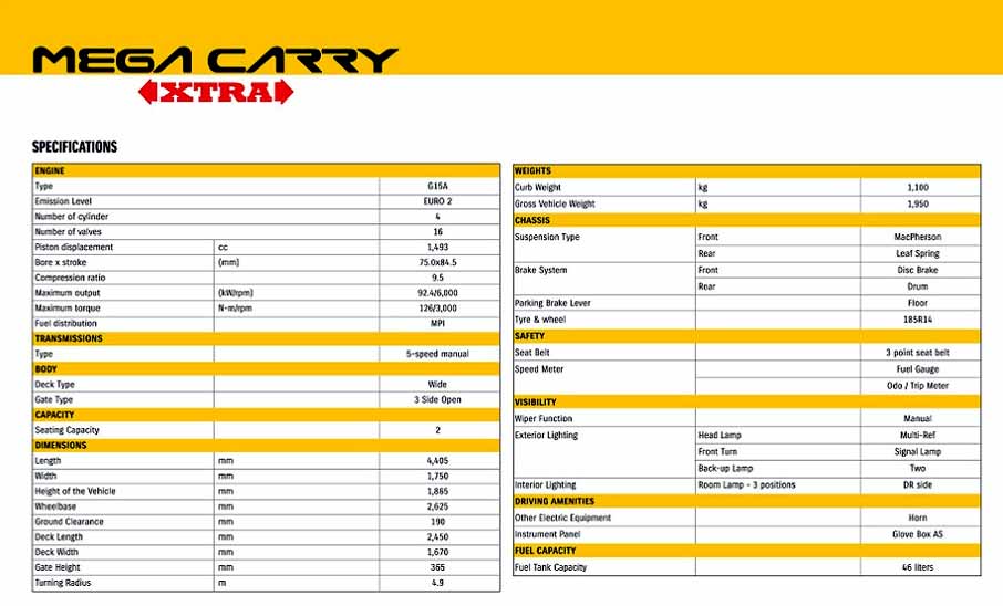 The fuel tank capacity is 46 litres and there a 5-speed manual transmission in the pickup. The engine has EURO 2 emission level and the vehicle is able to carry around 750 kg weight.