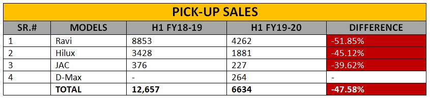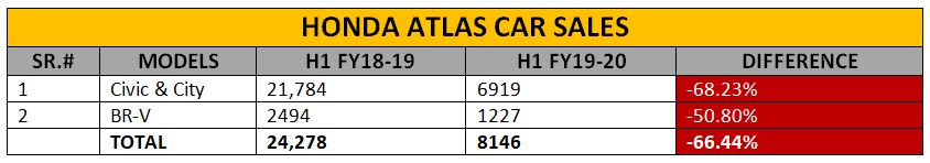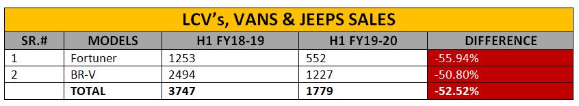 In this segment of vehicles, Honda Atlas sold more units BR-V as compared to Toyota Fortuner. As many as 1227 units of Honda BR-V were sold in H1 of FY 2019-20 whereas Toyota Indus could only sell 552 units of Fortuner. Nonetheless, both the compact SUVs suffered more than 50% plunge in their respective sales. The overall sales were also down by more than 52% in the period under review.