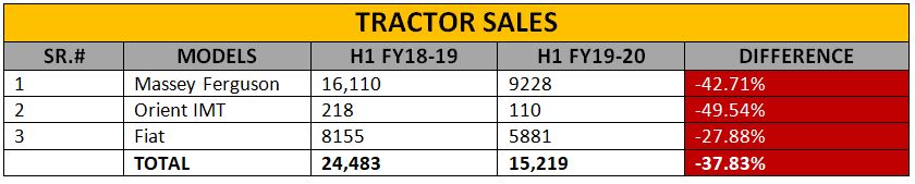 Massey Ferguson is a popular brand of tractor production in Pakistan. The company did sell 9228 units of its tractors in this period yet it witnessed a decline of nearly 43%. It shows the company’s selling power in the local sector. It was followed by Fiat with 5881 units as compared to 8155 units in the same period last year. It observed a drop of approximately 28% in its sales whereas the sales of Orient IMT tractors went down by almost 50% in this period. The overall sales were down by 38% in H1 of FY 2019-20.