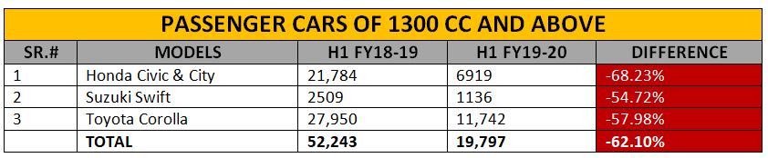 However, in the passenger cars of 1300 cc and above, Toyota Corolla remained the highest-selling car in the local sector. Toyota Indus sold only 11,742 units of Corolla in the July to December 2019 period, down by nearly 58% as compared to its corresponding period last year when the company sold 27,950 units. Honda Atlas managed to sell 6919 units of Civic and City combined in the first half of FY 2019-20 which shows a decline of more than 68%. The automaker sold 21,784 units of both cars combined in the same period last year. Pak Suzuki offers Swift in this category that also suffered a massive blow of nearly 55% drop in its sales to only 1136 units in the specified period.