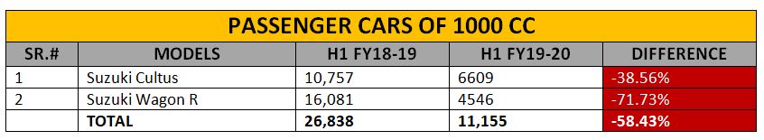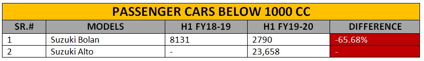 In the sales stats below 1000 cc engine capacity, the only highlight is the Pak Suzuki’s 660 cc Alto. The company has sold 23,658 units of the entry-level hatchback in the past six months that also drives the overall sales of the automaker in the country. The other vehicle in this segment is Suzuki Bolan that witnessed a drop of nearly 66% in this period.
