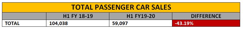 The overall passenger car sales in the local sector plunged by as much as 43.19% in the first half of the fiscal year 2019-20. In this period, 59,097 units of cars were sold as compared to 104,038 units last year.