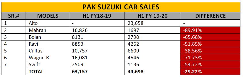 In just 7 months of its launch, Suzuki Alto became the top-selling car of the year leaving behind Toyota Corolla that remained in production throughout 2019. The entry-level hatchback was launched back in June 2019 and ever since its sales have been the highlight of the auto industry. The company sold 23,658 units of Alto in the six months of the ongoing fiscal year which is more than any other car during the whole last year. Suzuki Mehran was out of production line since the start of FY 2019-20 so the units available in the inventories just made up to 1697 units in this period. Apart from it, Suzuki Wagon R has seen the highest downfall in sales by nearly 72% followed by Bolan with 66%. Suzuki Cultus remained the least affected model in this economic crisis for Pak Suzuki. The overall sales of the auto player went down by more than 29% in this specified period. Pak Suzuki recently decided to close its production on all Mondays during January 2020. The complete stats are as under: