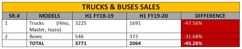 The sales of trucks also went down by 47.56% in the first half of the fiscal year 2019-20. In the same period, only 373 buses were sold as compared to 546 units last year, down by 31.68%. The overall sales declined by more than 45% in this economic contraction period. The individual sales stats of both trucks and buses are given in the table below: