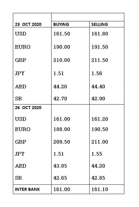 The price of 1 USD to PKR buying is Rs161.00 and selling of US Dollar is Rs161.20. British Pound (GBP) to PKR buying is Rs209.50 and selling is Rs211.00. Euro to PKR buying is Rs188.00 and selling is Rs190.50.