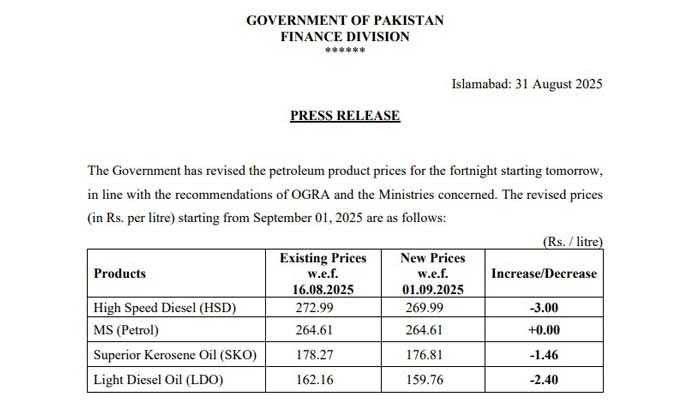 The price of light diesel oil has been set at Rs159.76 after a decrease of Rs2.40. The price of kerosene oil has been set at Rs176.81 after a decrease of Rs1.46.