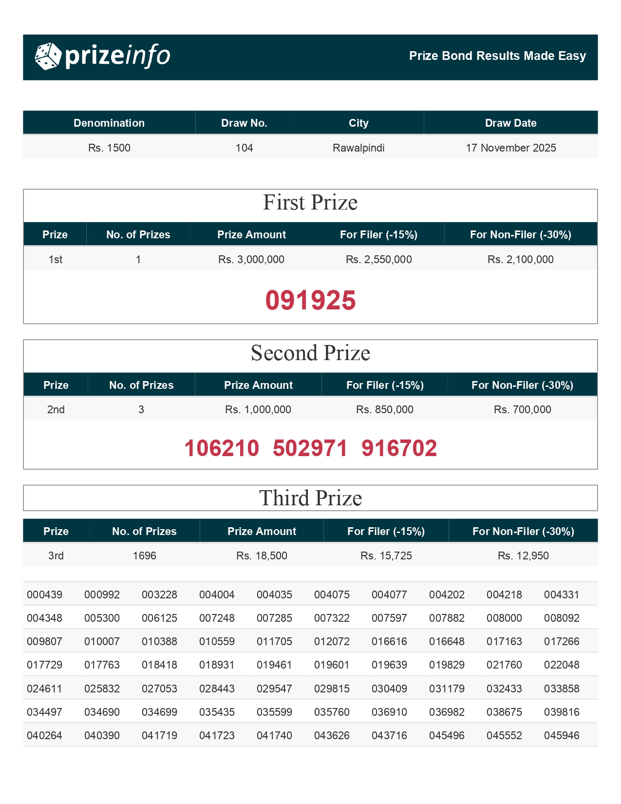 ISLAMABAD (Web Desk) – The Rs 1,500 prize bond draw, organised by National Savings, was held on November 17, 2025, at the National Savings Centre.