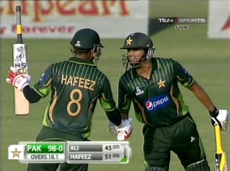 Hafeez (10) smashes four whereas Azhar Ali is on 4 scores.