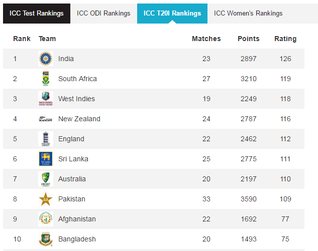 Pakistan team have been listed just above Afghanistan and Bangladesh cricket team while Indian team have maintained top position followed by South Africa and West Indies on second and third apiece.