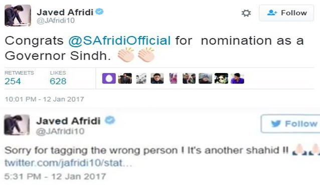 Javed Afridi mistakenly acclaimed Shahid Afridi as a new nominee for Sindh Governor. He tweeted, “Congrats @SAfridiOfficial for nomination as a Governor Sindh.”