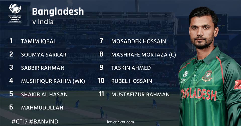 Tamim Iqbal, Soumya Sarkar, Sabbir Rahman, Mushfiqur Rahim, Shakib Al Hasan, Mahmudullah, Mosaddek Hossain, Mashrafe Mortaza (capt), Rubel Hossain, Taskin Ahmed, Mustafizur Rahman