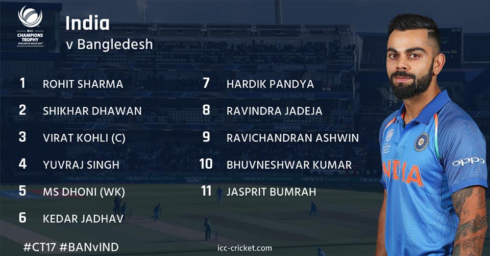 RG Sharma, S Dhawan, V Kohli (capt), Yuvraj Singh, MS Dhoni, KM Jadhav, HH Pandya, RA Jadeja, R Ashwin, B Kumar, JJ Bumrah