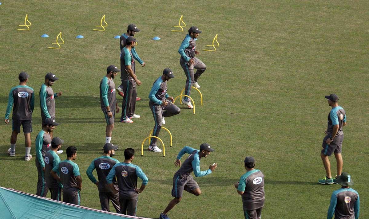 Players participate in practice session at Qaddafi Stadium