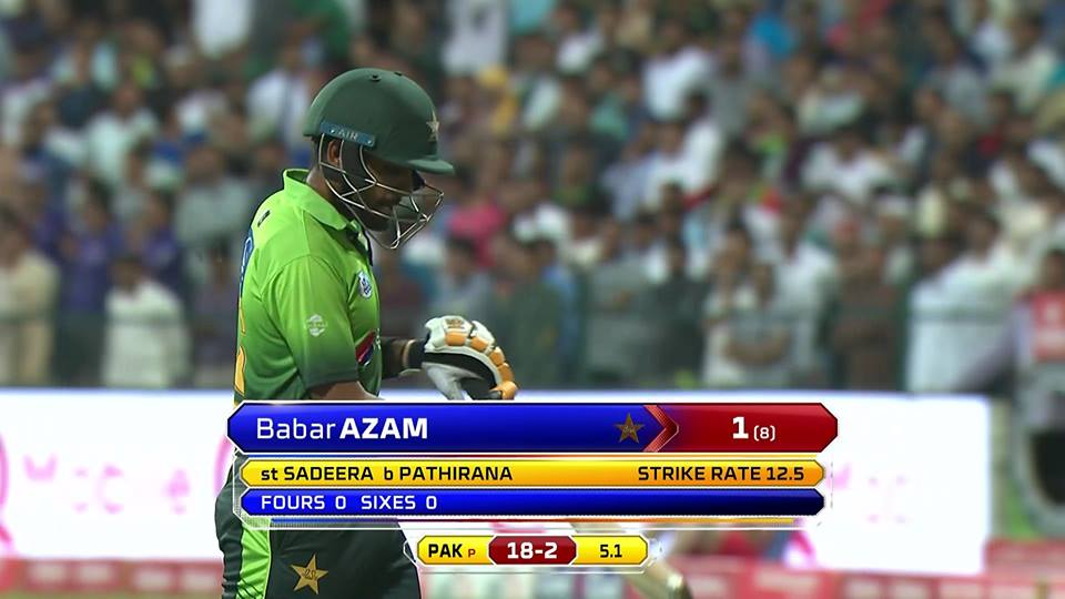 5.1 overs: OUT! Babar Azam is gone. After scoring just one runs off 7 balls, he is gone on the 8th as Pathirana draws him out of the crease and then beats him with the spin. Samarawickrama remove the bails and now Pakistan have lost 2 wickets for just 18 runs. They re making 103 look like 301.