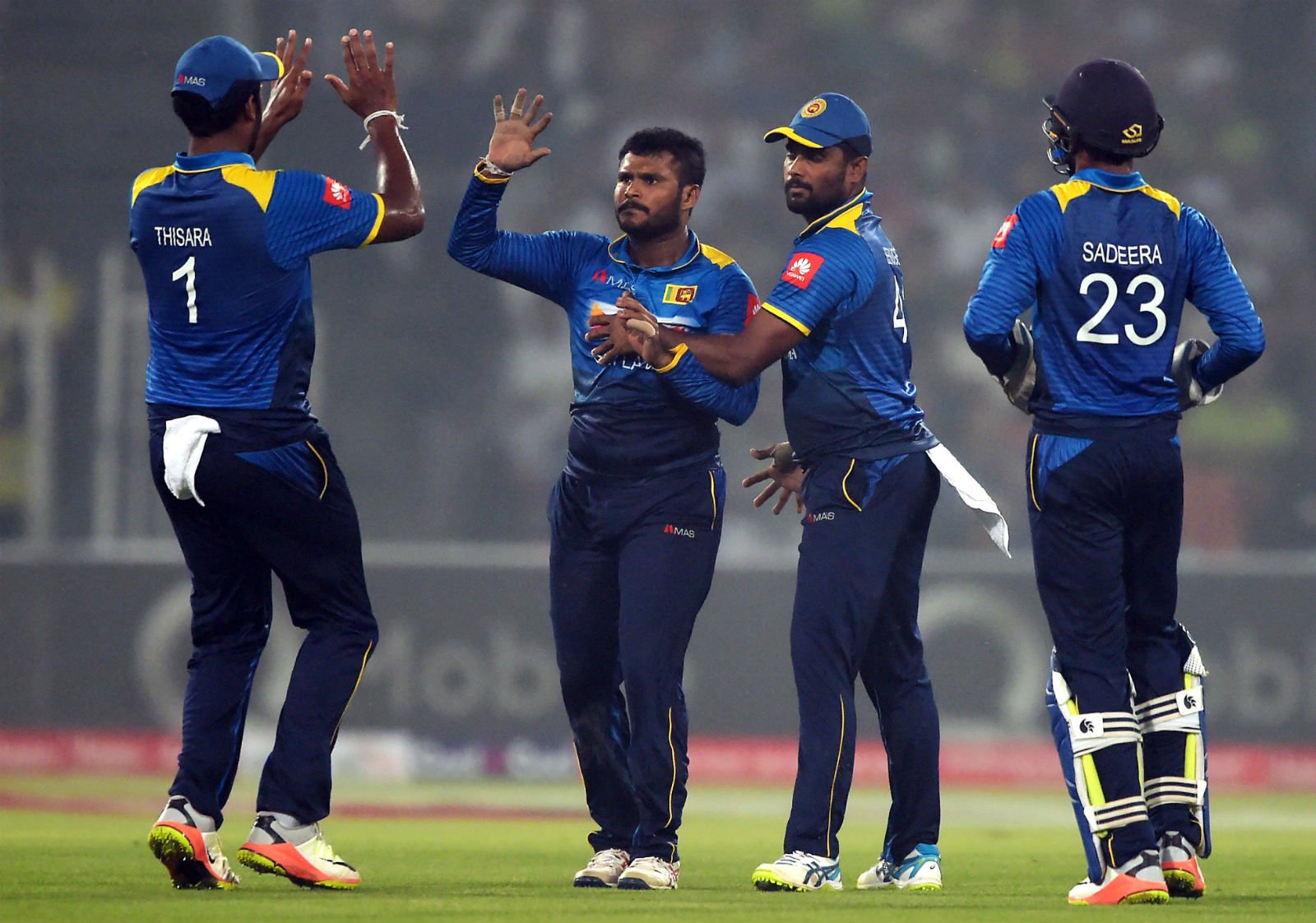 Pakistani players celebrate after dismissing a Sri Lankan batsman. Photo: OINN