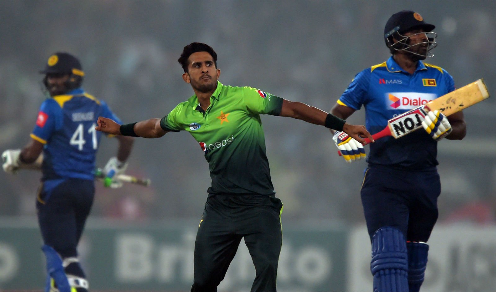 Pakistani bowler Hasan Ali (C) celebrates after taking the wicket of Sri Lankan cricket captain Thisara Perera (R). Photo: AFP