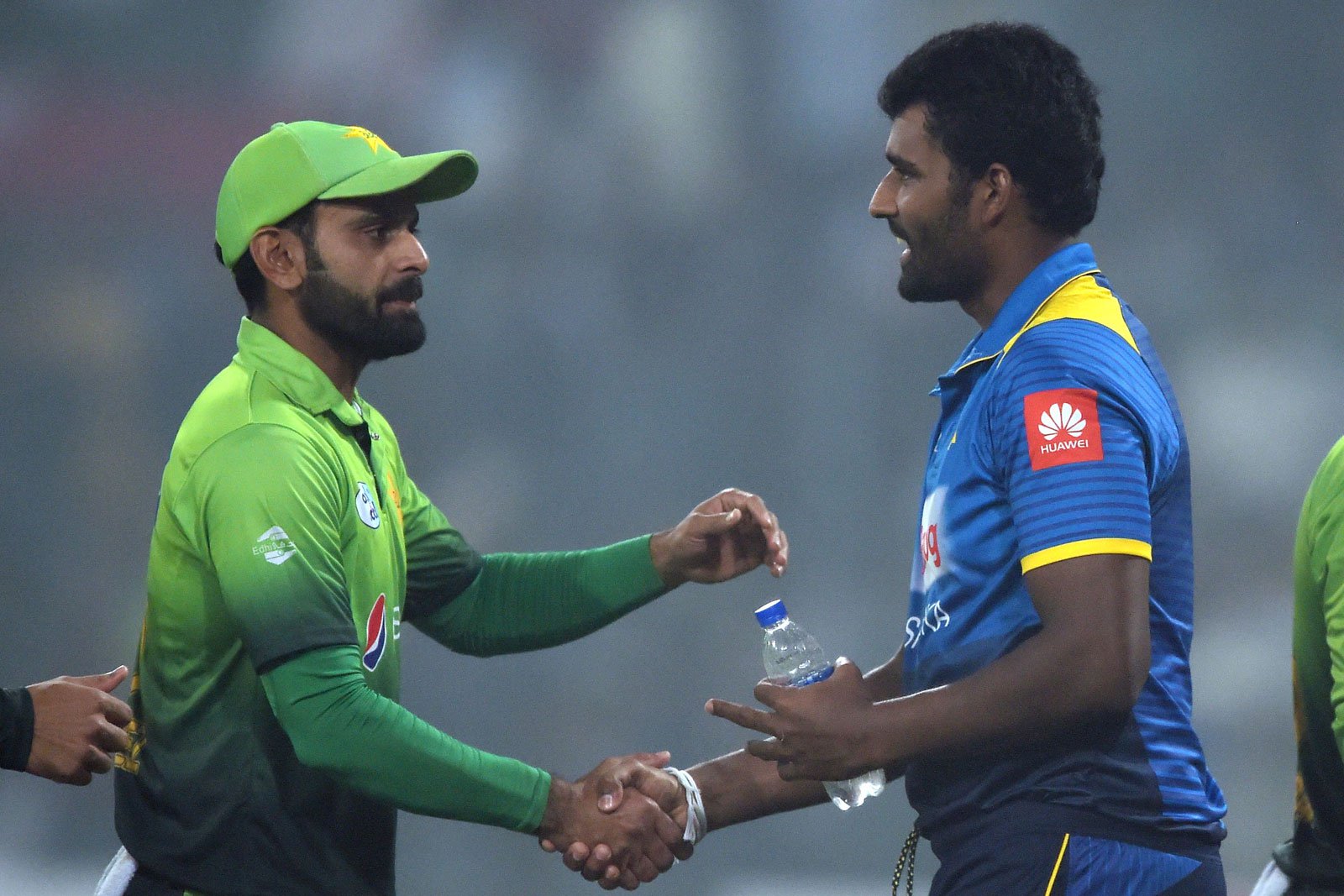 Sri Lankan cricket captain Thisara Perera (R) shakes hands with Pakistani cricketer Mohammad Hafeez (L) after Pakistan won by 36 runs. Photo: AFP
