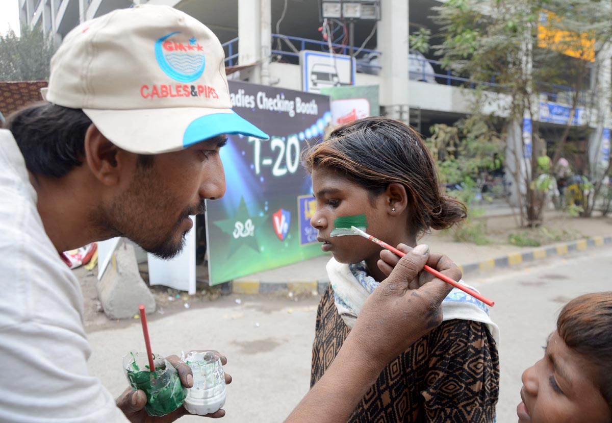 A man paints Pakistani flag on the face of a young girl outside Gaddafi stadium ahead of the third T20I. Photo: OINN