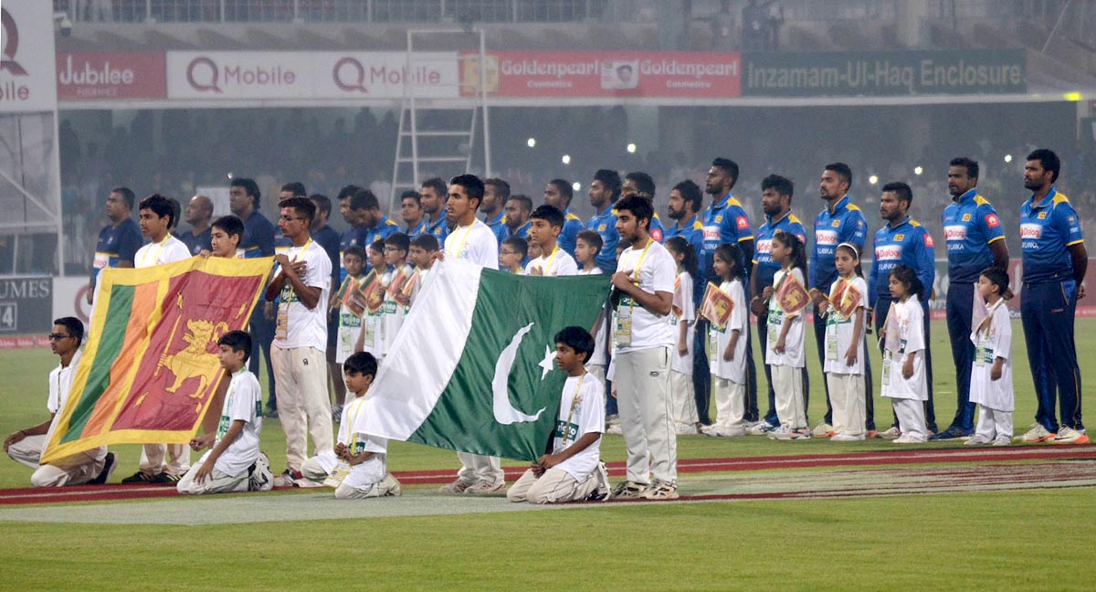Children hold flags of Pakistan and Sri Lanka during the national anthems of both countries ahead of the the third and final T20 match at Gaddafi stadium. Photo: OINN