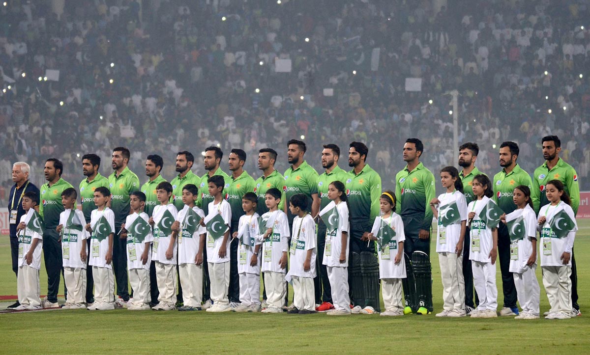 Players of Pakistan cricket team standing in respect of the national anthem ahead of the third T20 match against Sri Lanka. Photo: OINN