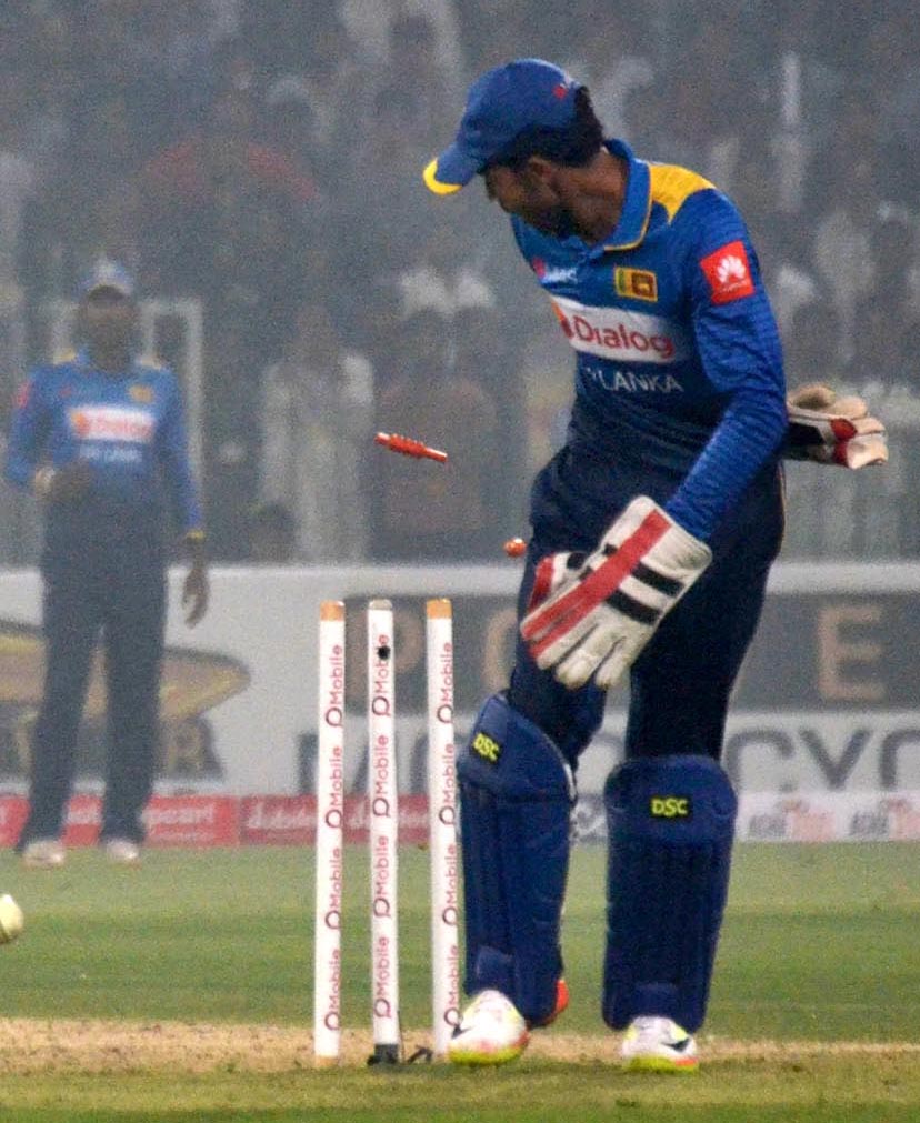 Bails fly in the air after a Pakistani batsman was clean bowled during the final T20 international against Sri Lanka. Photo: OINN