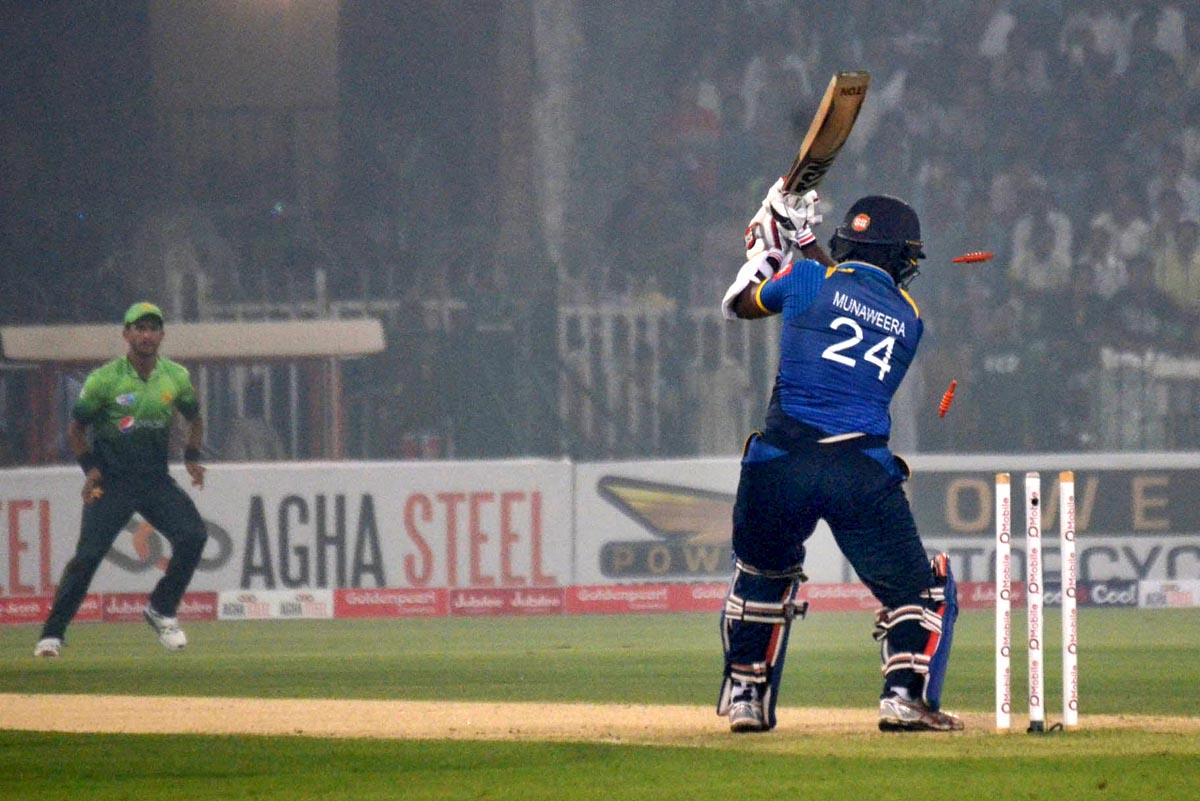 Sri Lankan batsman Munaweera gets clean bowled by Pakistani team. Photo: OINN