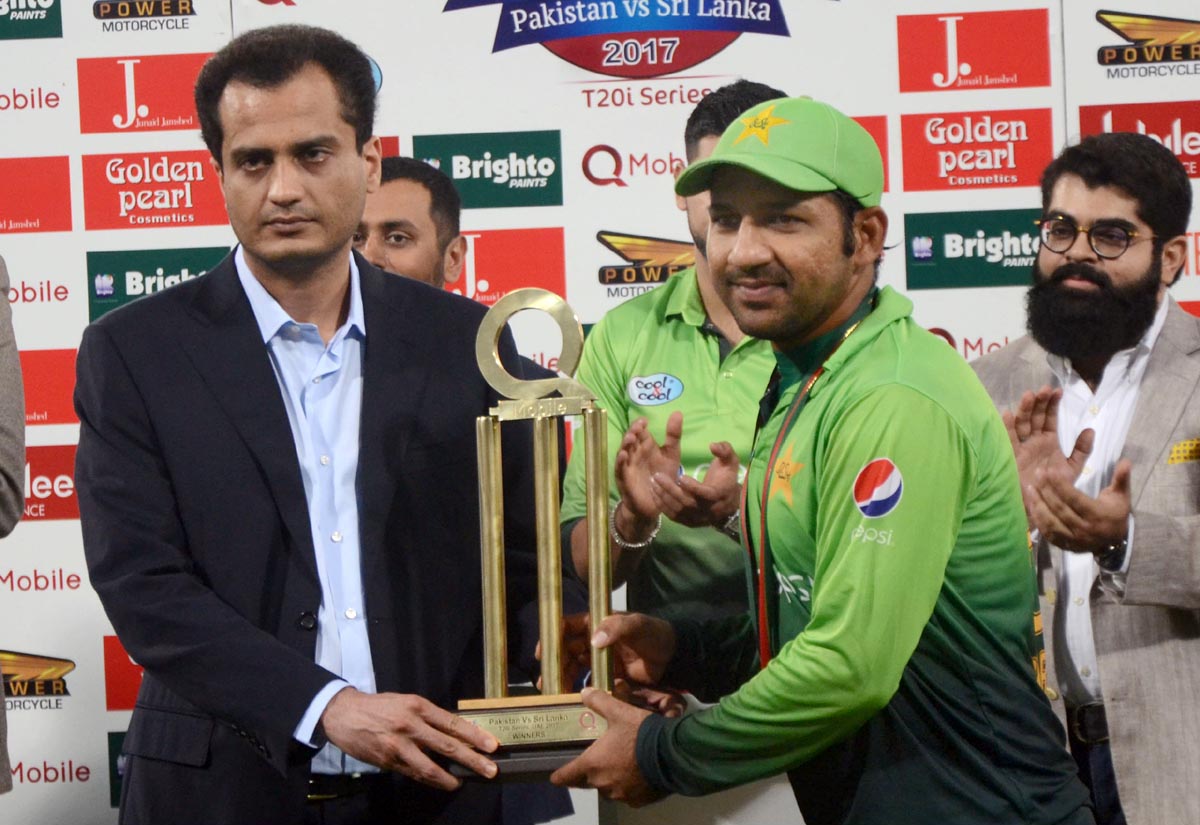 Pakistan skipper Sarfraz Ahmed receives the trophy after defeating Sri Lanka in the final T20I. Photo: OINN