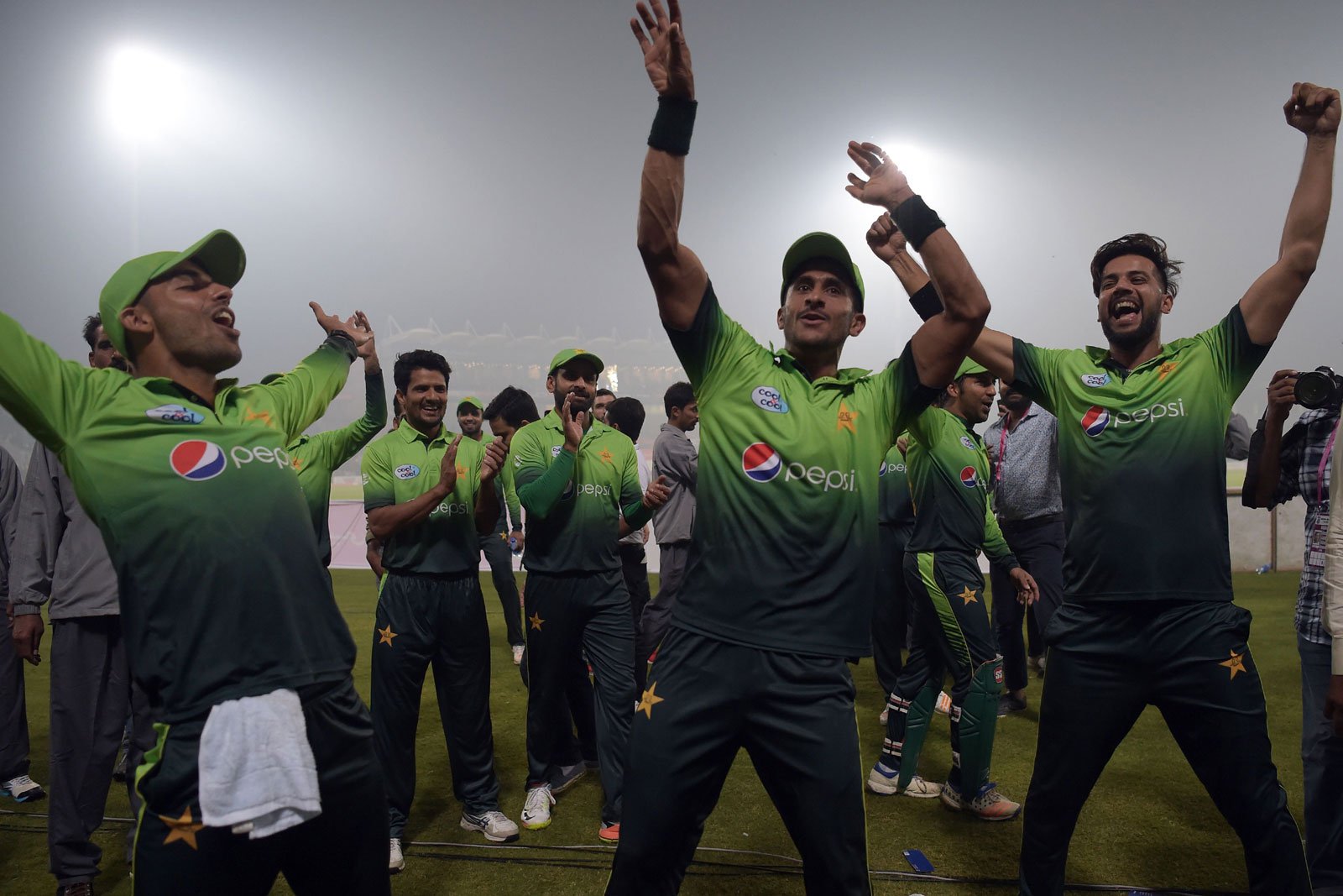 Pakistani cricket players celebrate after winning the third and final T20 match against Sri Lanka. Photo: AFP