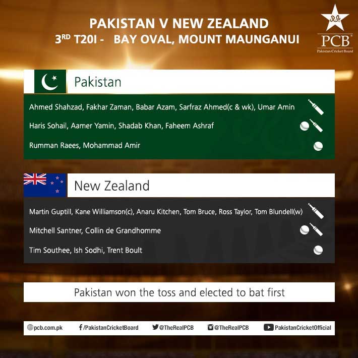 MOUNT MAUNGANUI (Dunya News/AFP) – Pakistan have on Sunday won the toss in the third and final Twenty20 International (T20I) of the series against the Blackcaps and decided to bat first.