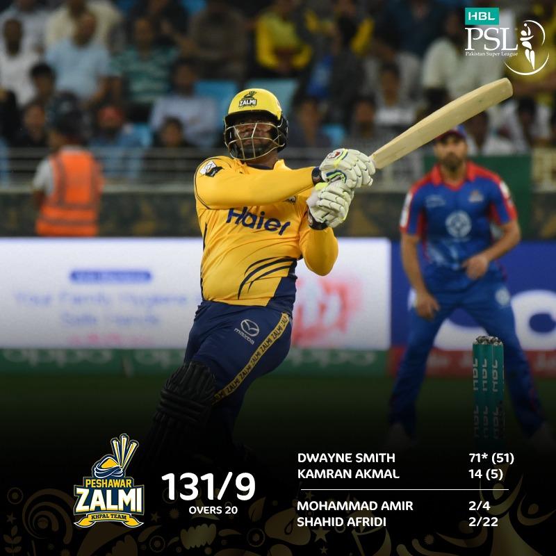 DUBAI (Dunya News) – Karachi Kings are chasing 132 target set by Peshawar Zalmi led by Darren Sammy in Pakistan Super League (PSL) 2018 match on Sunday in Dubai International Cricket Stadium.