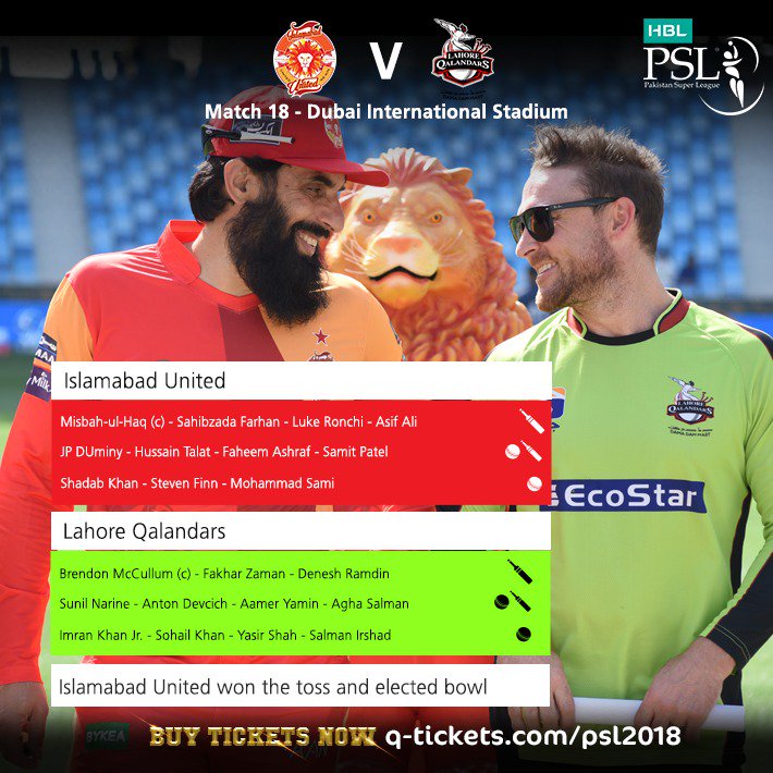 Lahore XI: BB McCullum (capt.), Fakhar Zaman, Agha Salman, D Ramdin (wk), SP Narine, AP Devcich, Aamer Yamin, Sohail Khan, Yasir Shah, Salman Irshad, Imran Khan (1)