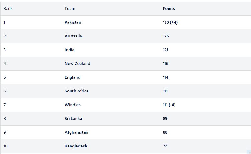 Meanwhile, Pakistan have opened up a four-point advantage over second-ranked Australia following a 3-0 win. In contrast, the Windies have dropped from fifth to seven after losing four points.