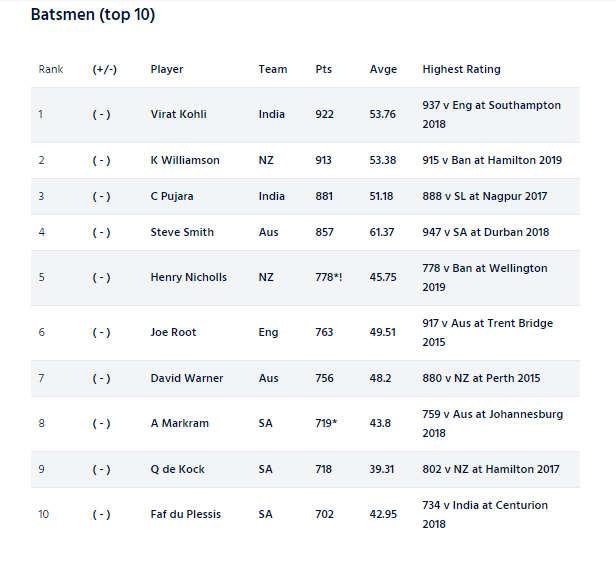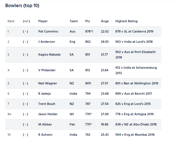 MRF Tyres ICC Test Player Rankings (as on 19 March 2019)