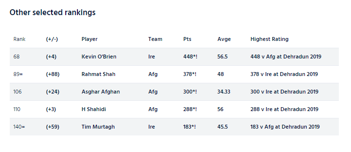 For Ireland, Kevin O-Brien has moved up four places to 68th while fast bowler Tim Murtagh has also gained in the list for batsmen after a rare Test half-century batting at No.11, his scores of 54* and 27 lifting him 59 places to 140th.