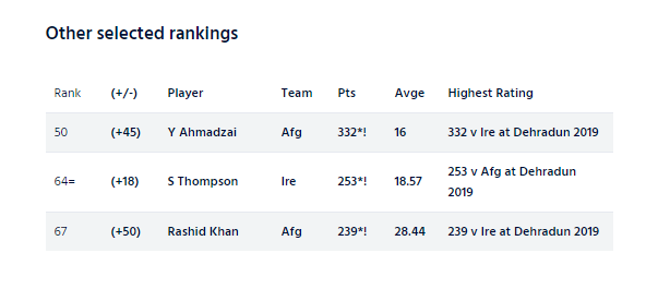 Fast bowler Yamin Ahmadzai and leg-spinner Rashid Khan have made rapid strides in the bowlers’ list.