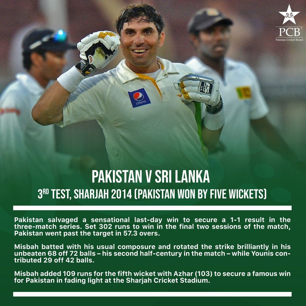 Misbah batted with his usual composure and rotated the strike brilliantly in his unbeaten 68 off 72 balls – his second half-century in the match – while Younis contributed 29 off 42 balls. Misbah added 109 runs for the fifth wicket with Azhar (103) to secure a famous win for Pakistan in fading light at the Sharjah Cricket Stadium.