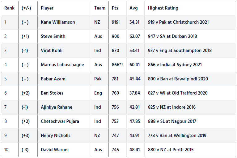 Williamson, named player of the series after leading his side to an innings and 176 runs win and a 2-0 victory in the two-Test series, has reached 919 rating points, bettering his own mark of 915 in December 2018. ICC Cricket Hall of Famer Richard Hadlee is the only other player from New Zealand to go past the 900-point mark, reaching a career-high 909 rating points in bowling in December 1985.