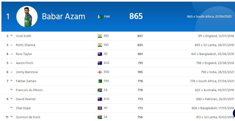 According to press released issued by ICC, the 26-year-old’s player of the match effort of an 82-ball 94 in the last match of the ICC Men’s Cricket World Cup Super League series against South Africa in Centurion has helped him gain 13 rating points to reach 865 points and he now leads the Indian captain by eight points.